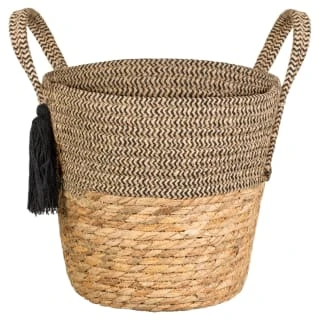 This cotton rope storage basket features a striking tassel detail and handles.